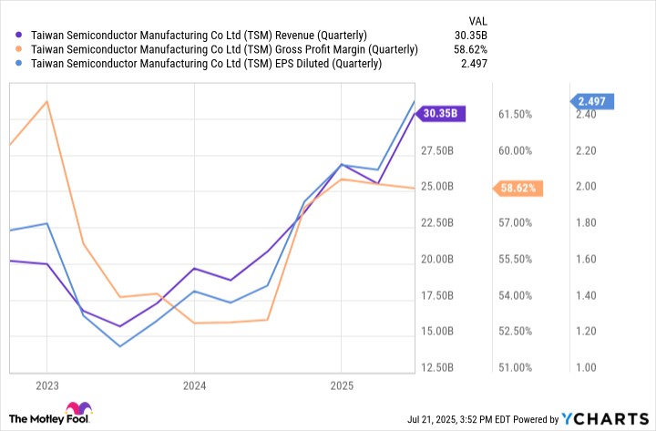 TSM 收入(季度)數據來自 YCharts;EPS = 每股收益。