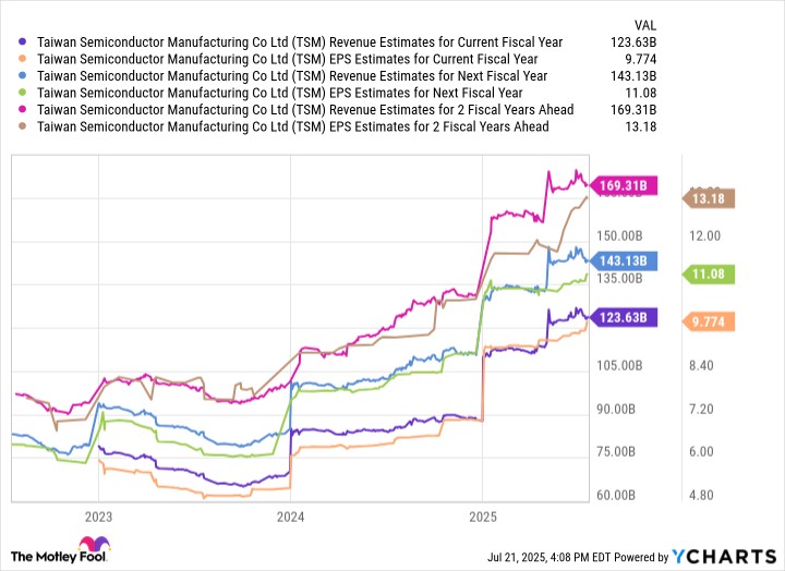 TSM 當前財政年度的收入預測;數據來自 YCharts。