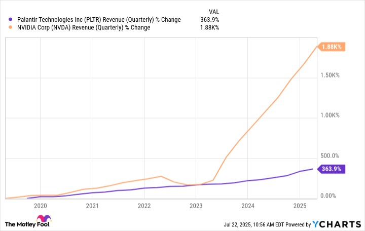 Nvidia's revenue growth is absolutely trouncing Palantir's -- it isn't even close. What's worse, however, is that Palantir's stock price has dramatically outperformed its relatively modest fundamentals.