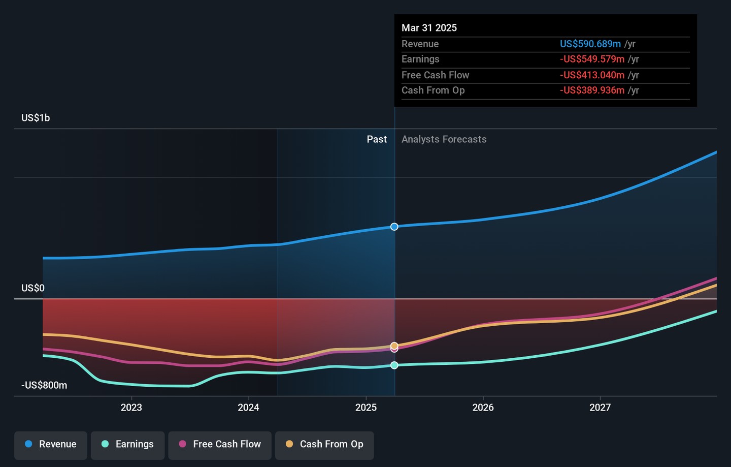 Ultragenyx Pharmaceutical's outlook projects $1.3 billion in revenue and $140.6 million in earnings by 2028. This requires a 31.2% annual revenue growth rate and an earnings increase of $690.2 million from current earnings of -$549.6 million.