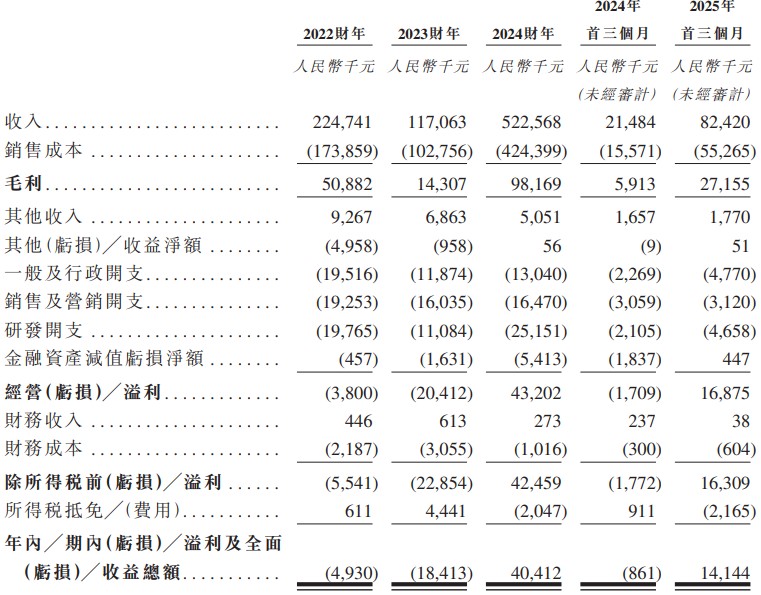 In terms of finances, the company achieved revenues of approximately RMB 225 million, RMB 117 million, RMB 523 million, and RMB 82.42 million for the fiscal years 2022, 2023, 2024, and the first three months of 2025, respectively During the same period, the total profit and comprehensive income for the year/period were -4.93 million, -18.413 million, 40.412 million, and 14.144 million RMB, respectively.