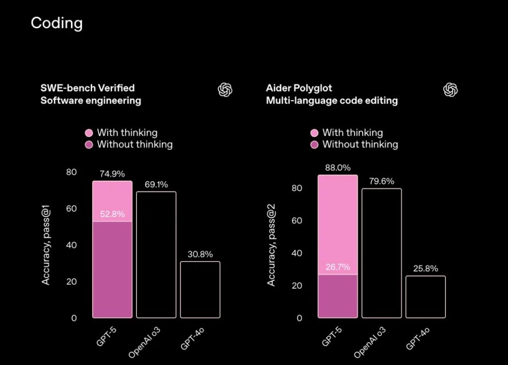 In the programming field, which OpenAI emphasized this time, GPT-5 has shown a noticeable improvement in the thinking mode compared to its predecessor.
