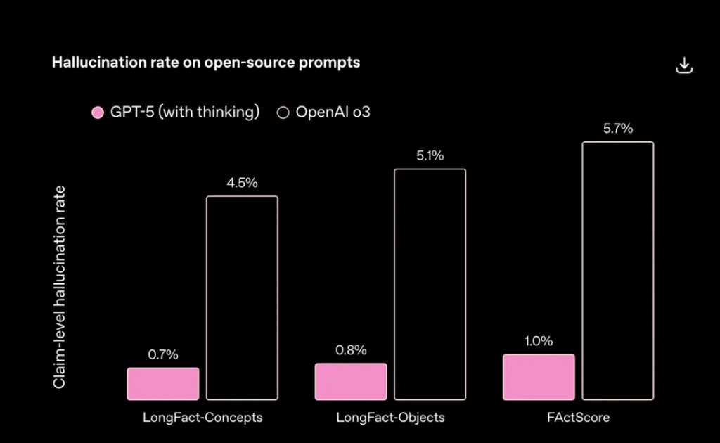 First is hallucination and safety. GPT-5 significantly reduces the occurrence of hallucinations, with a probability of factual errors about 45% lower than GPT-4o and about 80% lower than OpenAI o3.