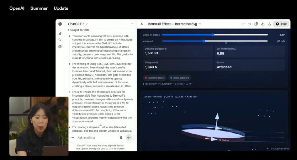 Another improvement of GPT-5 in programming is its front-end capabilities. During a live demonstration, OpenAI researchers had GPT-5 generate a series of content on-site, including a dynamic display of aircraft aerodynamics.