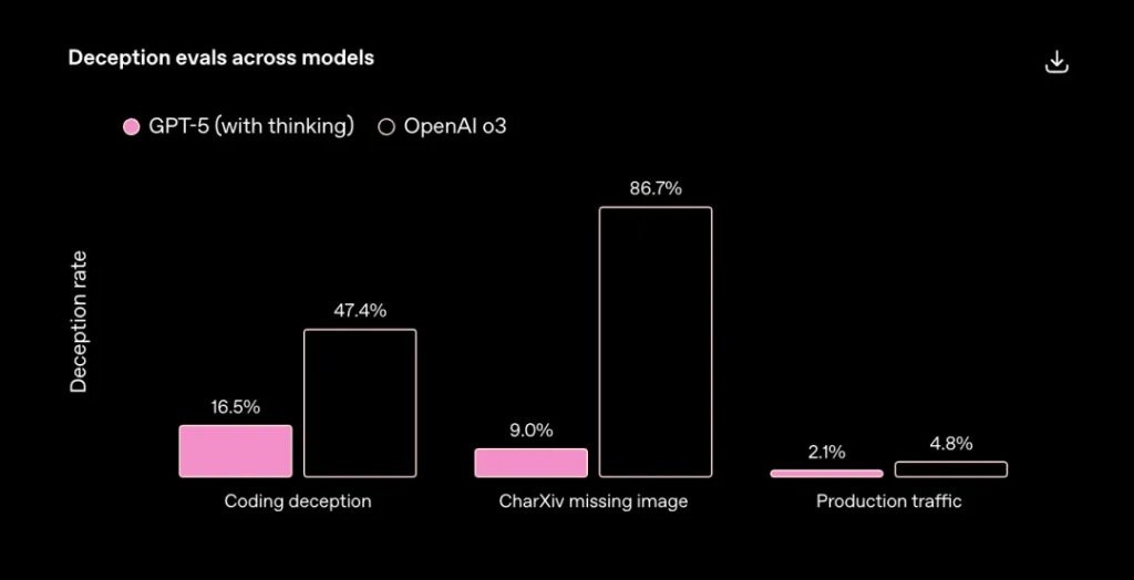 It is precisely because of this training model that the "deceptive" behavior of the GPT-5 model has also significantly decreased, with reductions of nearly 90% in some dimensions. (Deception here refers to the model potentially misleading users about its behavior or quietly not executing tasks when it cannot complete them or lacks sufficient information. This is also directly related to the decrease in hallucinations.)