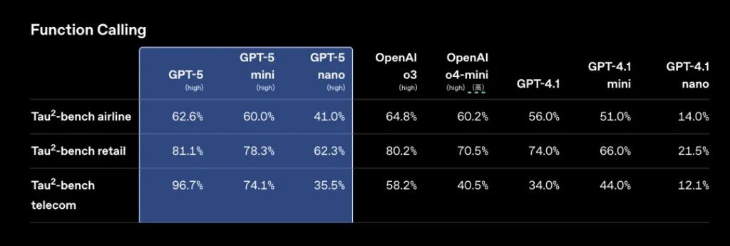 This is particularly evident in the Tau test set. It is used to evaluate an AI model's ability to engage in dynamic conversations with users in simulated real-world scenarios and effectively use external tools (i.e., API or function calls) to complete tasks. In the telecommunications field, its capability has significantly improved.