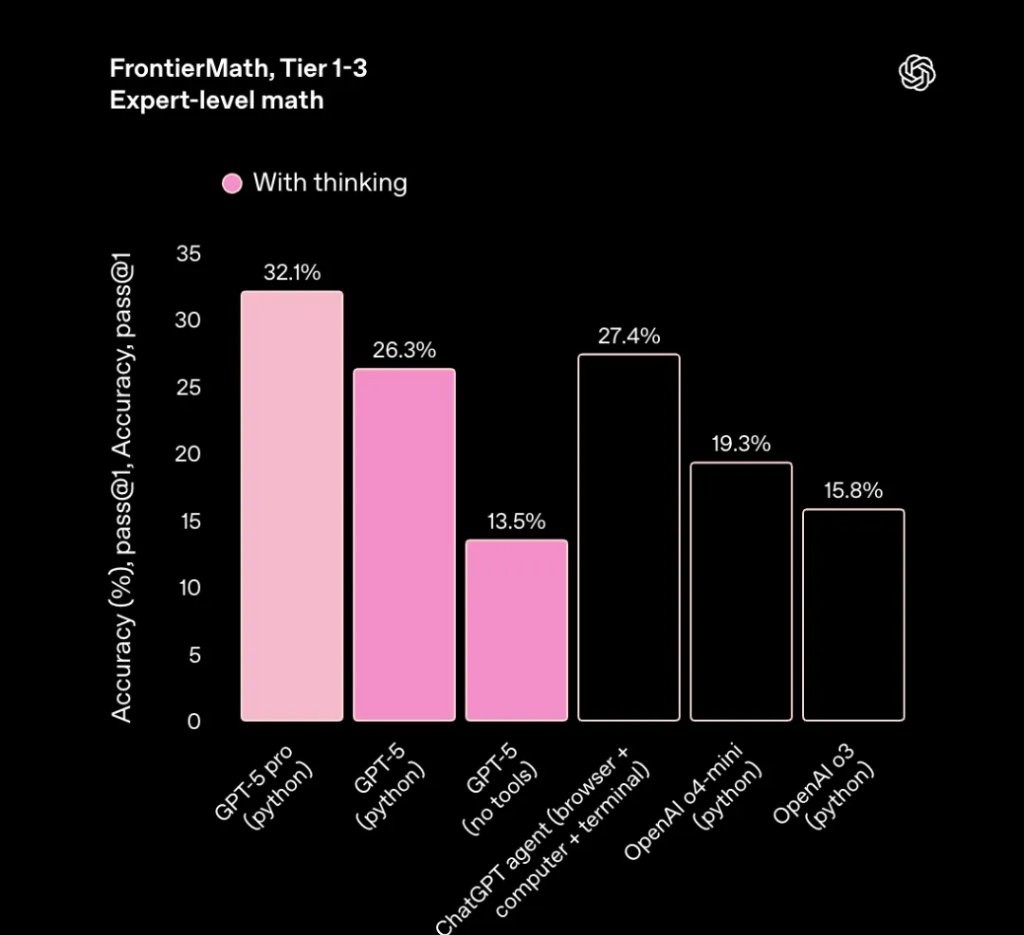 Breaking it down, we can see that in the cutting-edge math test set, the performance of GPT-5 is not as good as ChatGPT Agent, only showing stronger results in Pro mode.