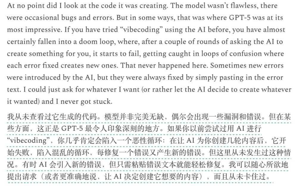 It is evident that OpenAI has truly applied the mindset of a product manager to programming, making substantial adjustments and upgrades to address pain points. In tests conducted by Wharton School professor Ethan Mollick, he also experienced the "worry-free" characteristics of GPT-5 programming.