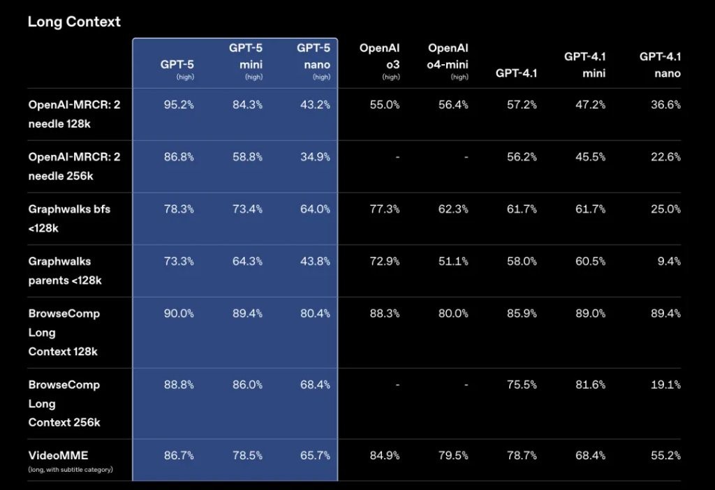 First, all versions of GPT-5 currently support a context length expanded to 400k, far exceeding the 128k default context of o3 and 4o. Although it cannot match Gemini's 1M context length, it is already a step ahead compared to other competitors.