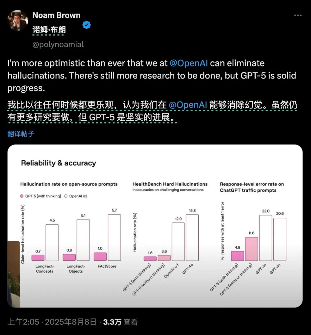 So, it's no wonder that OpenAI's core researcher Noam Brown dedicated the only comment regarding the press conference to GPT-5's progress in eliminating hallucinations.
