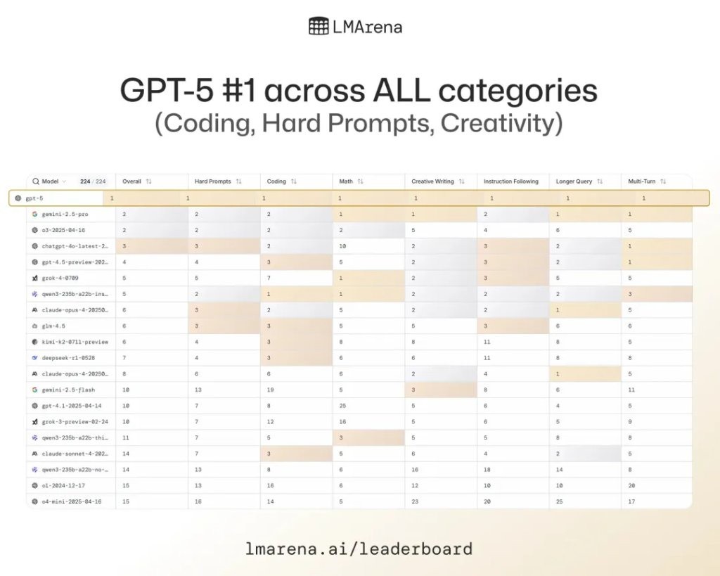 On the LMArena leaderboard, which primarily compares different models through user blind tests, GPT-5 ranked first in all categories.