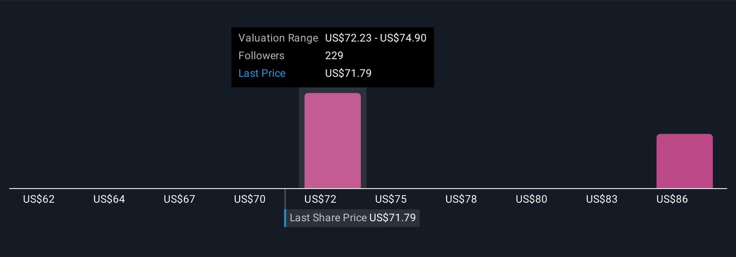 Simply Wall St Community members provided nine fair value estimates for Cisco Systems, ranging from US$61.52 to US$88.28 per share. With competitive pressures from white-box and ODM vendors influencing the company’s revenue and margins, reader viewpoints span a broad set of scenarios for Cisco’s future performance.