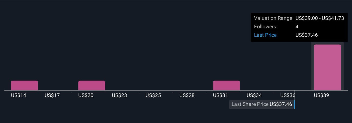 Four Simply Wall St Community analysts estimate fair value between US$14.38 and US$41.73 per share. With heavy reliance on key brands as a major risk, these diverse views remind you to consider multiple outcomes for future performance.