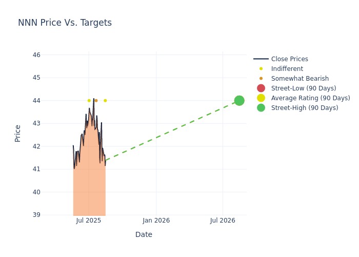 - 評級: 分析師提供的定性見解揭示了股票表現,從 “跑贏大盤” 到 “跑輸大盤”。這些評級傳達了對 NNN REIT 相對於更廣泛市場表現的預期。