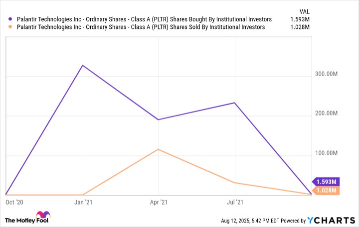 The chart below tracks buying activity in Palantir stock across institutional investors since its initial public offering (IPO) in late 2020.