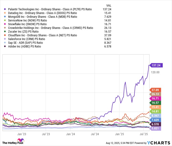 Palantir has completely redefined how next-generation technology businesses are valued, though. As of Aug. 12, Palantir boasts a market cap of nearly $444 billion -- larger than Salesforce, SAP, and Adobe, which are far more mature, diversified businesses. Perhaps even more striking is that Palantir's P/S of 137 exists in its own stratosphere -- completely outside the dimensions of its software-as-a-service (SaaS) peers.