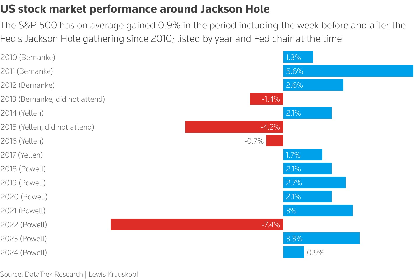 DataTrek noted the S&P 500 fell in 2013 and 2015 when Fed chairs Ben Bernanke and Janet Yellen did not attend the symposium.