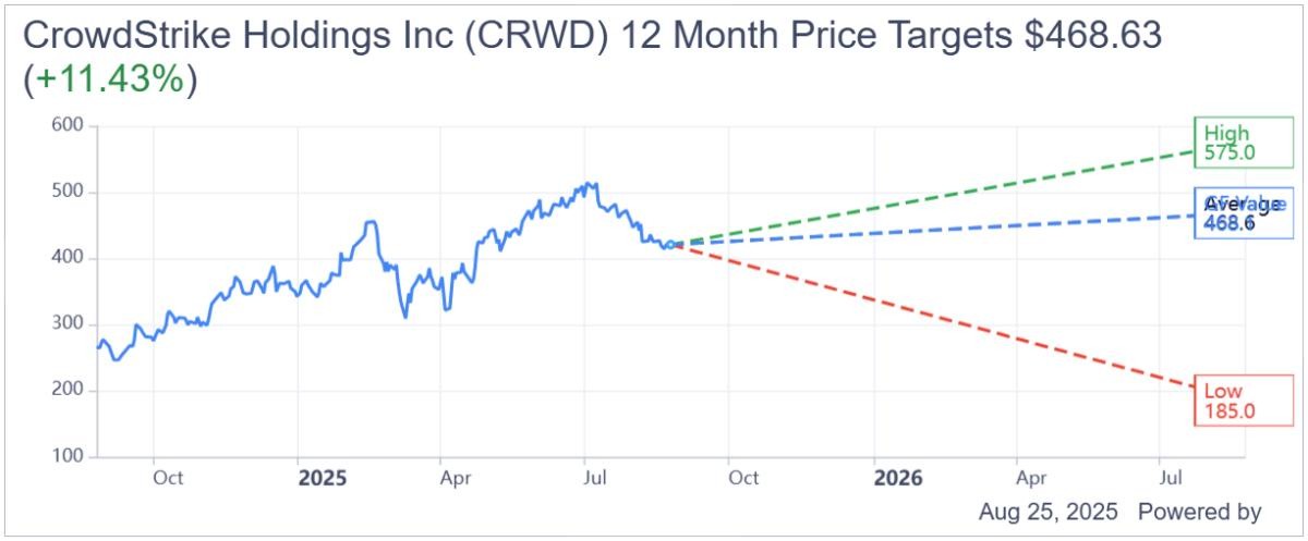 Based on the one year price targets offered by 48 analysts, the average target price for CrowdStrike Holdings Inc is $468.63 with a high estimate of $575.00 and a low estimate of $185.00. The average target implies a upside of +11.43% from the current price of $420.55.