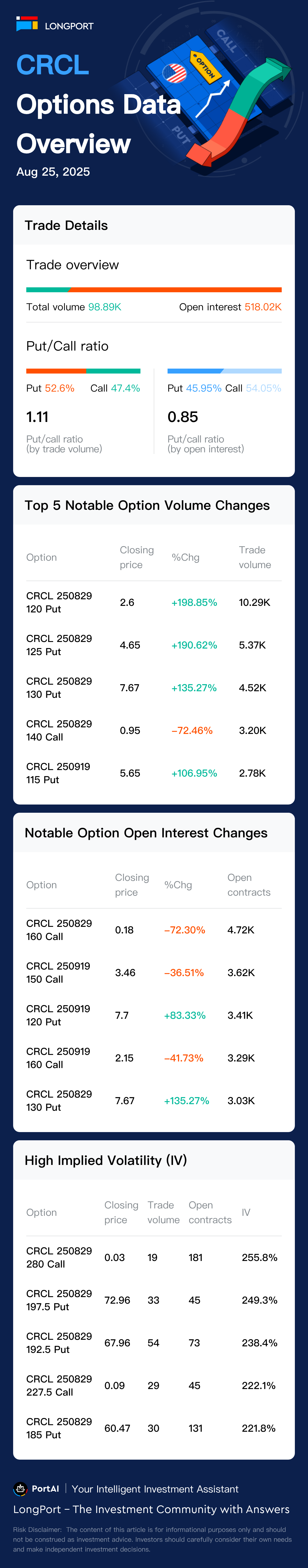 On August 25, Eastern Time, Circle options saw a total of 98888 contracts traded, with calls accounting for 47% and puts making up 52%.
