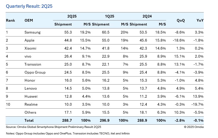 Omdia: In the second quarter of 2025, the global smartphone market saw a slight decline of 0.1%, and market uncertainty continues in the second half of the year