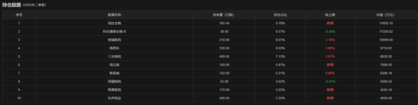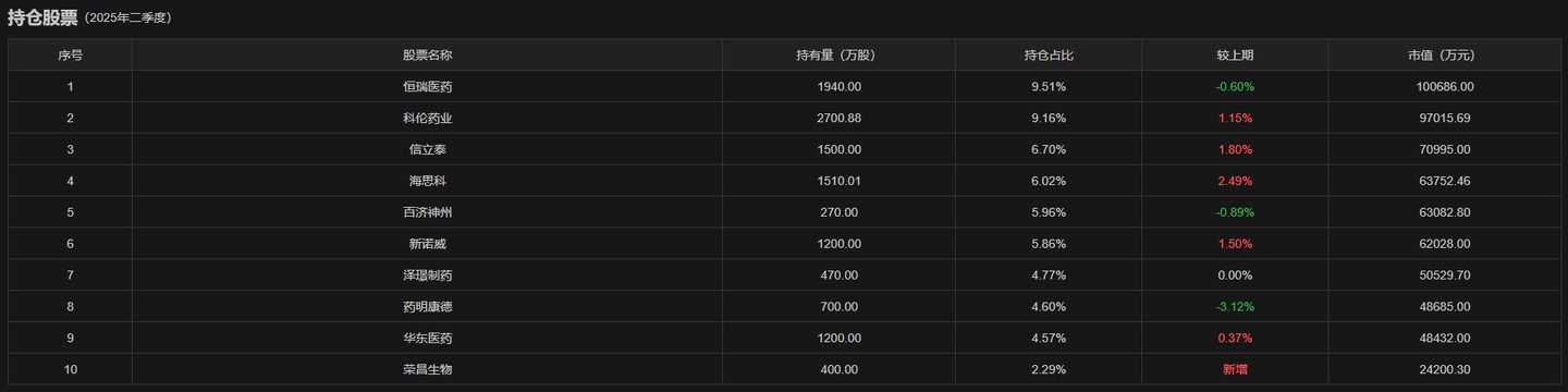 ICBC Frontier Medical mainly holds A-share pharmaceutical stocks. From the latest key holdings, as of the end of the second quarter, the top ten heavy holdings of the ICBC Frontier Medical Stock Fund were Heng Rui Medicine (600276.SH), Ke Lun Pharmaceutical (002422.SZ), Xin Li Tai (002294.SZ), Hai Si Ke (002653.SZ), Bai Ji Shen Zhou (688235.SH), Xin Nuo Wei (300765.SZ), Ze Jing Pharmaceutical (688266.SH), WuXi AppTec (603259.SH), Hua Dong Pharmaceutical (000963.SZ), and Rong Chang Bio (688331.SH). Among them, Rong Chang Bio entered the top ten heavy holdings in the second quarter, while Yu Yued Medical exited the top ten heavy holdings.