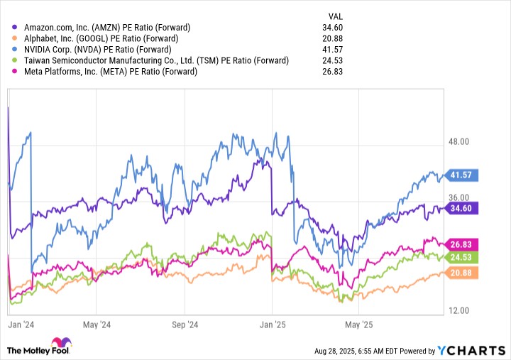 With the integration of generative AI into the traditional Google Search, Alphabet has bridged a gap that many investors feared would be the end for Google. This hasn't been the case, and Alphabet's impressive 12% growth in Google Search revenue in Q2 supports that. Despite its strong growth, Alphabet is by far the cheapest stock on this list, trading for less than 21 times forward earnings.