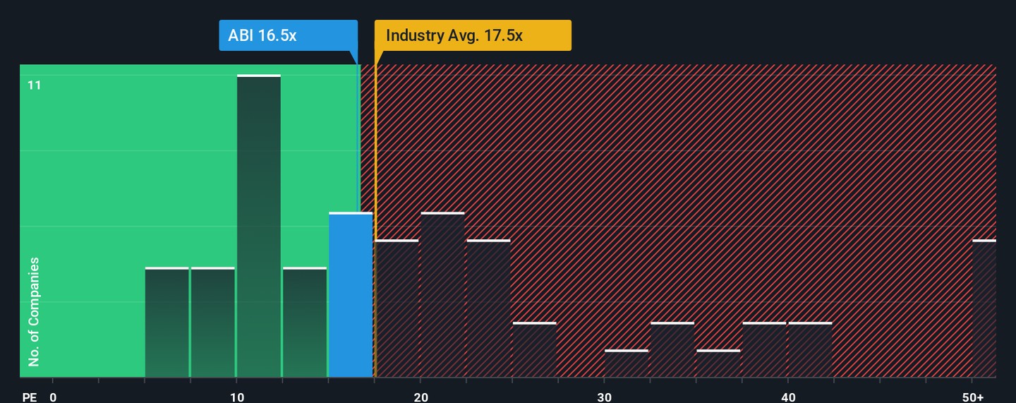 There wouldn't be many who think Anheuser-Busch InBev SA/NV's (EBR:ABI) price-to-earnings (or "P/E") ratio of 16.5x is worth a mention when the median P/E in Belgium is similar at about 16x. Although, it's not wise to simply ignore the P/E without explanation as investors may be disregarding a distinct opportunity or a costly mistake.