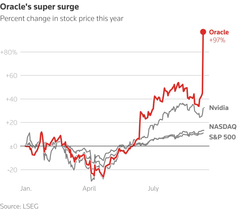 More on that below. In my column today I look at how the extraordinary rise in Oracle’s share price on Wednesday has reignited the already fiery debate over whether U.S. tech and AI stocks are in a bubble.