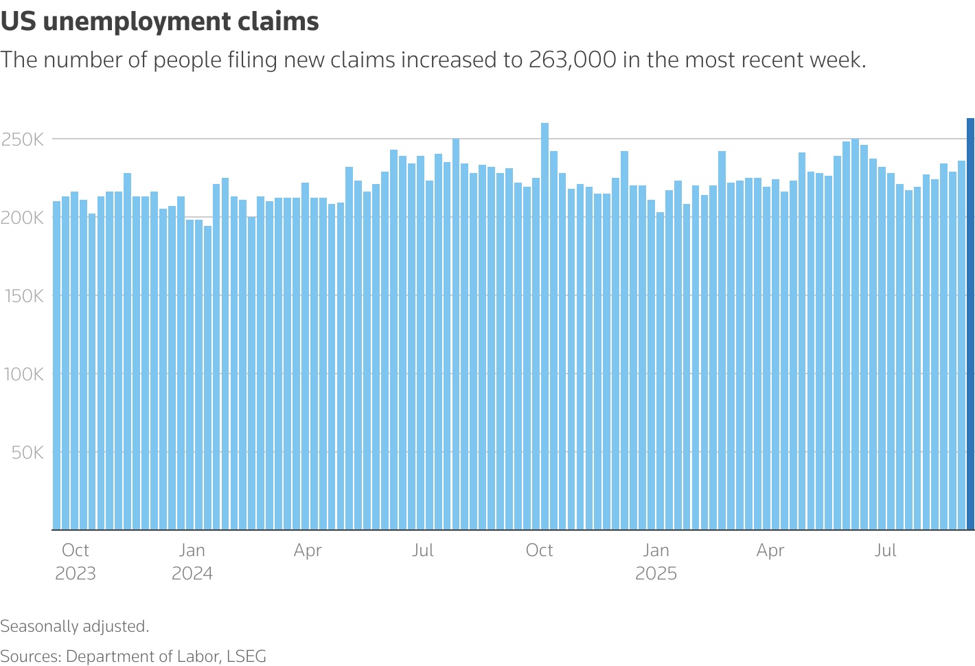 華爾街的三大主要指數在美國失業救濟申請激增後創下新高,這增強了市場對美聯儲降息的預期。標準普爾 500 指數、納斯達克和道瓊斯指數均創下紀錄,而甲骨文的股價飆升重新引發了關於潛在科技和人工智能泡沫的討論。與此同時,美元對多種貨幣貶值,10 年期國債收益率跌破 4%。歐洲中央銀行則維持利率不變,表明經濟前景保持平衡