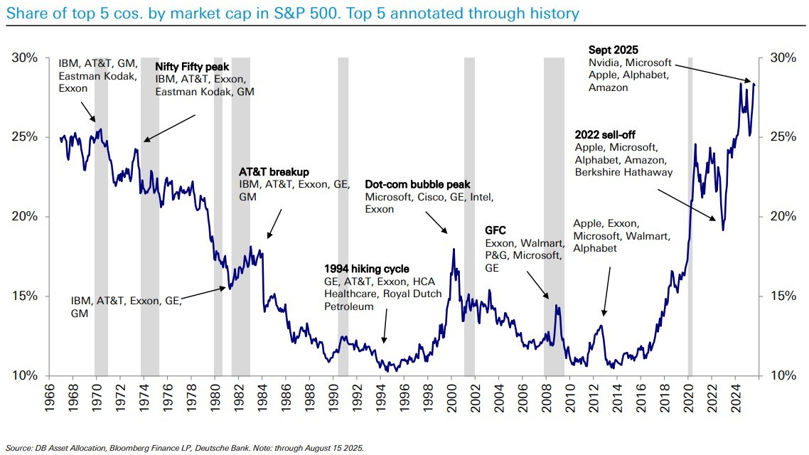 標準普爾 500 中前五家公司合計權重接近 30%,高於 1960 年代末/1970 年代初的 “精英五十” 和 2000 年互聯網泡沫破裂前科技公司的水平。