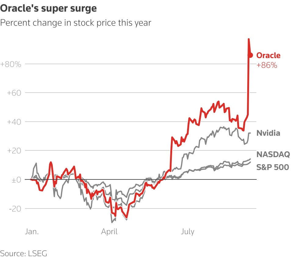 關於這一點,下面會有更多內容。在我今天的專欄中,我將探討週三甲骨文股價的非凡上漲如何重新點燃了關於美國科技和人工智能股票是否處於泡沫中的激烈辯論。