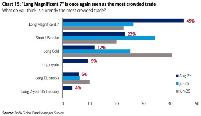 美國銀行 8 月份的基金經理調查顯示,目前全球市場上最擁擠的交易再次是 “做多七大巨頭”,根據 45% 的受訪者的説法。大多數人(52%)表示他們沒有看到人工智能泡沫,這表明在這一擁擠的交易解開之前,可能會變得更加擁擠。