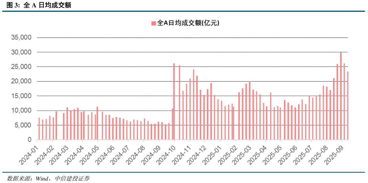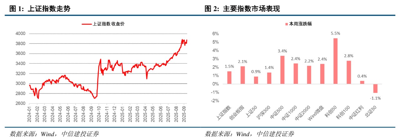 本週A股V形反彈,上證指數上漲1.5%,週五盤中一度突破前高,觸及3892.7點。市場成交方面,近期有所縮量,8 月最後一週創下日均近 3 萬億的成交額後,9 月第一週回落至日均 2.6 萬億左右,本週為日均 2.3 萬億左右,市場情緒高位整理,狀態尚未崩塌。