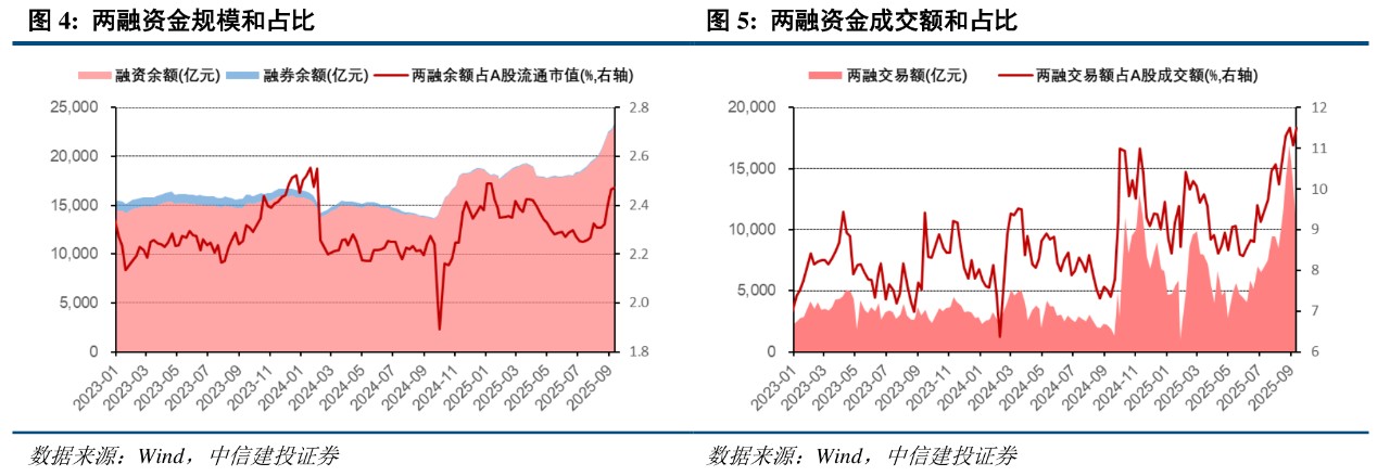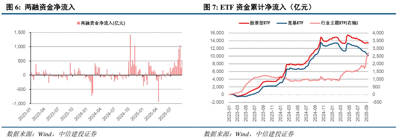AI 算力主線迴歸,資金情緒有所修復,存款搬家趨勢延續。上證指數上漲 1.5%,週五盤中一度突破前高;全球 AI 景氣共振,AI 算力主線迴歸,科創 50 指數大漲 5.5%。8 月最後一週創下日均近 3 萬億的成交額後,9 月第一週回落至日均 2.6 萬億左右,本週為日均 2.3 萬億左右。截至本週四,兩融資金成交額佔比回升至 11.5%,與前高持平,兩融資金淨流入 518 億元,相較上週的 256 億元出現明顯改善。ETF 資金近期整體增量有限,但近 4 周行業主題 ETF 淨流入 1010 億元,顯示出個人投資者正在穩步入場。另一方面,8 月居民户新增人民幣存款 1100 億元,弱於歷史季節性,非銀機構新增人民幣存款 11800 億元,強於歷史季節性。