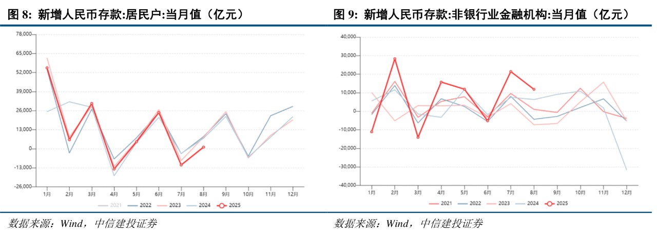 本週資金情緒也有所修復,存款搬家趨勢延續。截至本週四,兩融資金成交額佔比回升至 11.5%,與前高水平持平,兩融資金淨流入 518 億元,相較上週的 256 億元出現明顯改善。ETF 資金方面,近期整體增量有限,但近 4 周行業主題 ETF 淨流入 1010 億元,顯示出個人投資者正在穩步入場。另一方面,8 月居民户新增人民幣存款 1100 億元,弱於歷史季節性,非銀機構新增人民幣存款 11800 億元,強於歷史季節性。