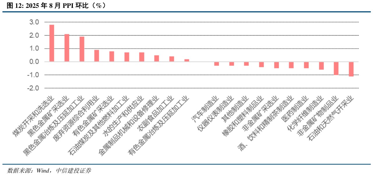 8 月 PPI 環比持平,結束了此前連續 8 個月的環比負增;PPI 同比下降 2.9%,較前兩個月的-3.6% 出現明顯回升。分行業來看,煤炭、石油、鋼鐵、有色等上游行業 8 月 PPI 環比出現較大幅度改善,反內卷政策或已開始逐步顯效,隨着後續政策持續發力,效果有望進一步擴散。