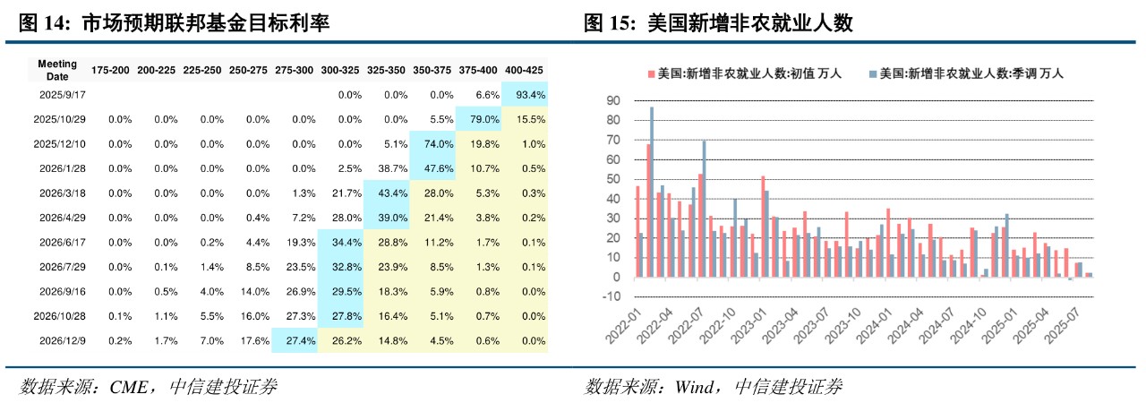 海外降息預期再度升温。美國目前通脹情況較為平穩,而勞動市場呈現疲弱態勢,機構加大美聯儲降息力度押注。目前 9 月降息 25BP 已經基本板上釘釘,市場預期隨後年內可能還有 2 次共 50BP 的降息。