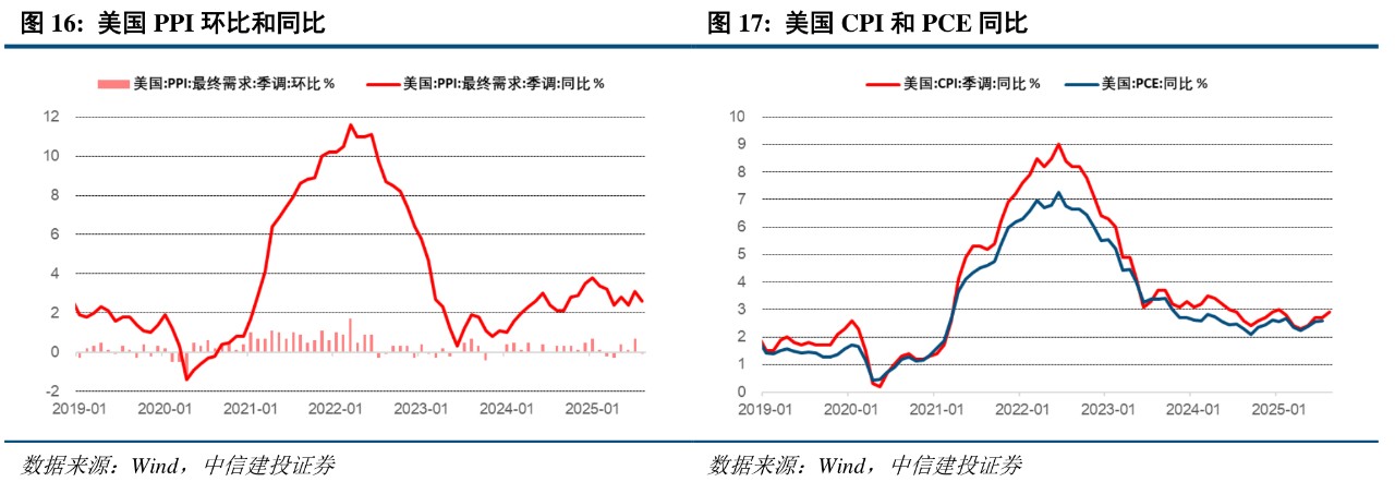 PPI 數據不及預期,進一步支持了美聯儲降息的理由。美國 8 月 PPI 環比意外下降 0.1%,市場預期為增長 0.3%,前值為增長 0.7%,PPI 同比僅增長 2.6%,市場預期為 3.3%,前值為 3.1%;8 月 CPI 同比上漲 2.9%,雖較前值 2.7% 有所提升,但符合市場預期。