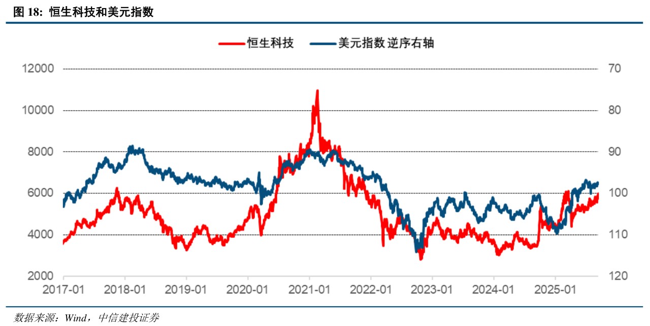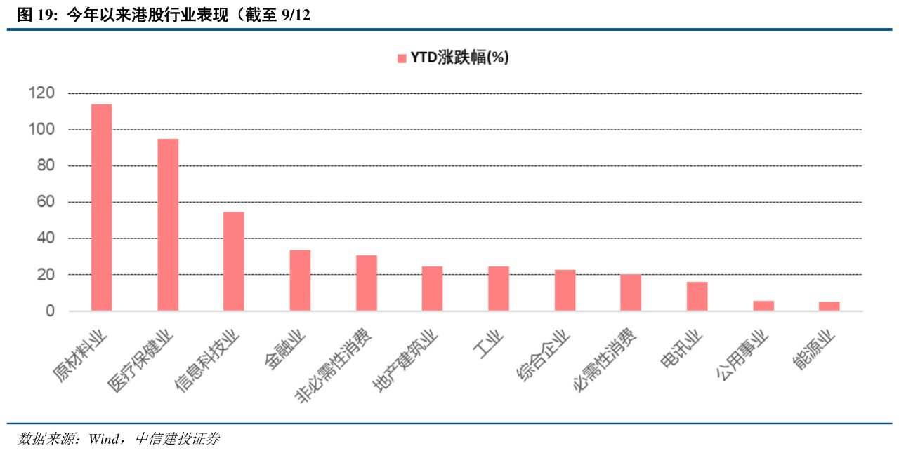 美聯儲降息、美元走弱、海外資金流動性寬裕後,港股市場有望承接一部分流動性外溢,恒生科技指數市場表現與美元指數走勢關係密切。今年以來美元指數從 110 走弱至 100 下方,有色、創新藥、互聯網等方向對此反應較為靈敏,港股原材料、醫療保健、信息科技行業表現靠前。