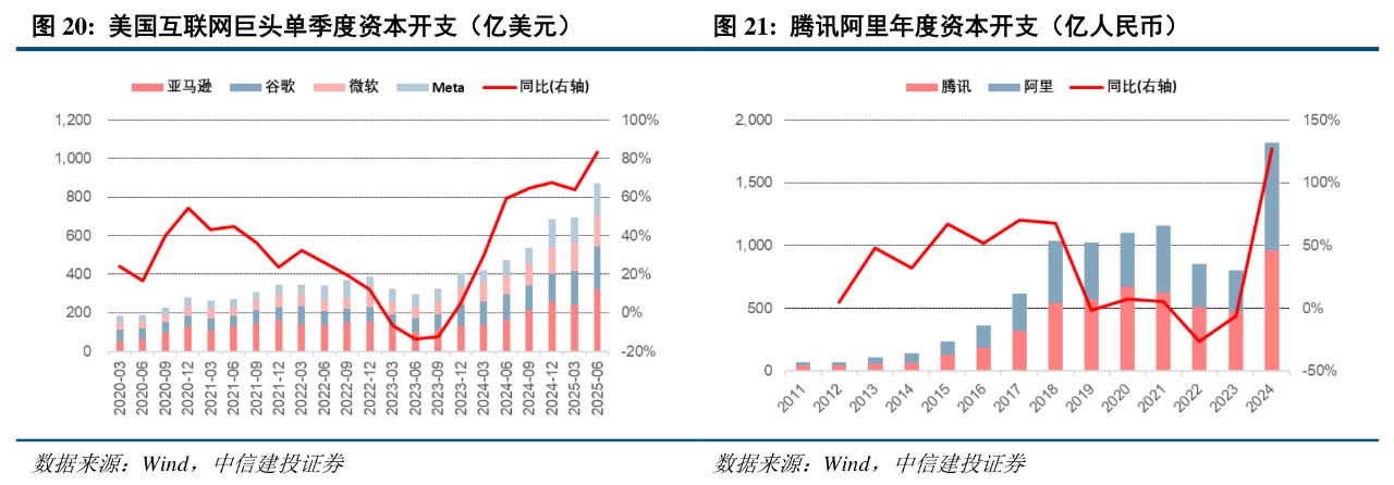 全球AI基礎設施投入進入加速期,頭部芯片與雲廠商業績持續超預期,印證算力需求的爆發式增長。英偉達 2026 財年第二季度營收達 467 億美元(同比 +56%),數據中心收入同比增長 56%,其新發布的 Rubin CPX GPU 專為海量上下文處理設計,進一步強化算力供給能力;甲骨文 AI 業務剩餘履約義務達 4550 億美元(同比 +359%),雲業務本財年預計增長 77%;騰訊阿里等國內廠商資本開支也保持高增態勢。同時,國產芯片自主可控進程加快,DeepSeek-V3.1 模型適配新一代國產芯片,形成 “芯片 - 模型” 生態閉環,有效緩解海外供應鏈擾動。