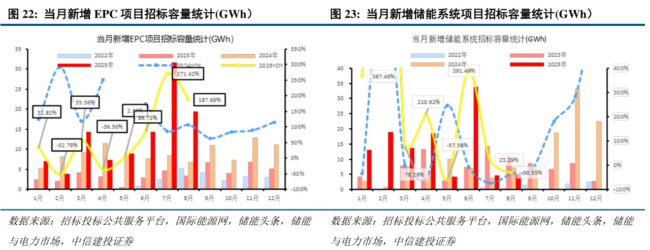 國內儲能招標高增。1-8 月累計新增招標 218.54GWh,同比 +125.37%,其中 EPC106.71GWh,儲能系統 111.83GWh。一方面,容量補償、容量電價等收益政策多省出台,儲能項目收益確定性提升;另一方面,新能源全面入市峯谷價差拉大,配儲能夠提升項目經濟性。