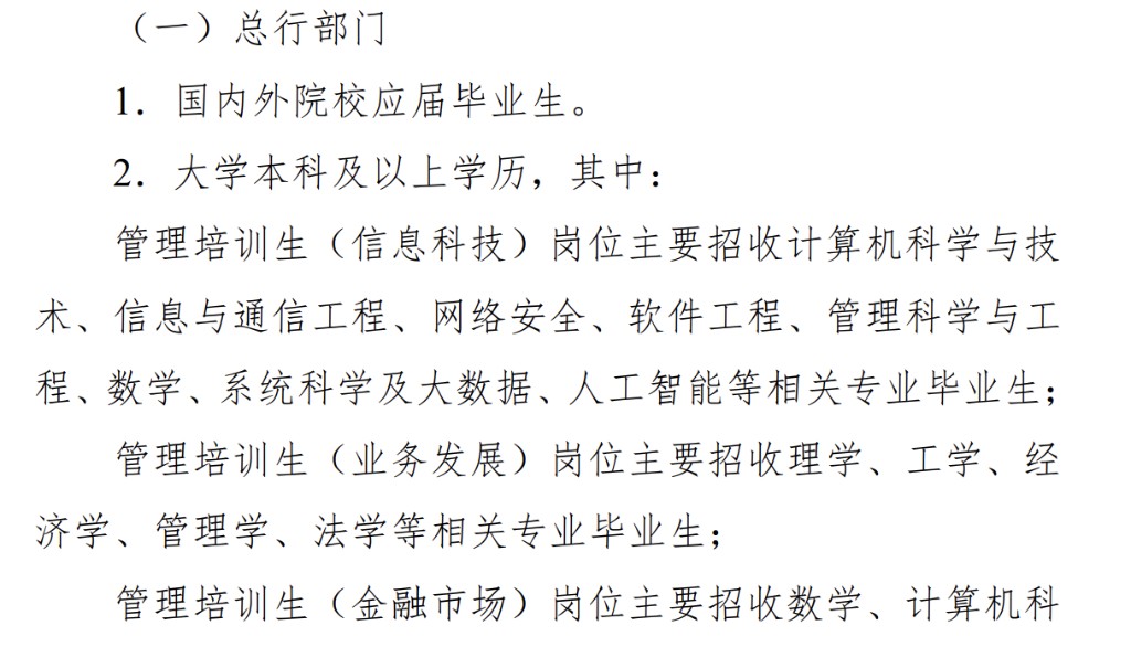 其中,“人工智能 +” 专项计划招聘 20 人左右。人工智能、大数据等相关专业优先。入职后会先在科技机构和境内分行进行为期一年的轮岗锻炼,期满后返回总行,定向安排到对公、零售、风控等业务部门相关岗位工作。