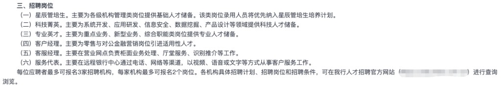 招聘岗位包括:1)主要为各级机构管理类岗位基础人才储备的 “星辰管培生”;2)主要为系统开发、应用研发、信息安全、数据挖掘、产品设计等领域提供科技人才储备的科技菁英;3)主要为重点业务、新型业务、综合职能类岗位提供专业人才储备的专业英才;4)主要为零售与对公金融营销岗位引进适用性人才的客户经理;5)主要在营业网点负责柜面业务处理、厅堂服务、识别推介等工作的客服经理;6)主要在远程银行中心通过电话、网络等渠道,以视频、语音或文字等方式从事客户服务工作服务代表等。