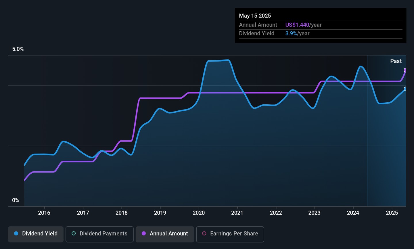 Virginia National Bankshares 提供穩定的股息歷史,過去十年支付可靠,支持其 40.6% 的低派息比率。儘管其 3.58% 的收益率低於美國市場的前四分之一,但股息一直在持續增長。最近 14.5% 的盈利增長和穩定的淨收入表明財務健康,但未來的股息覆蓋仍不確定。該公司以低於估計公允價值的價格交易,增強了其對價值投資者的吸引力。