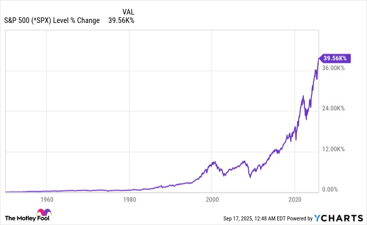 ^SPX data by YCharts. S&P 500 return from Jan. 3, 1950-Sept. 16, 2025.