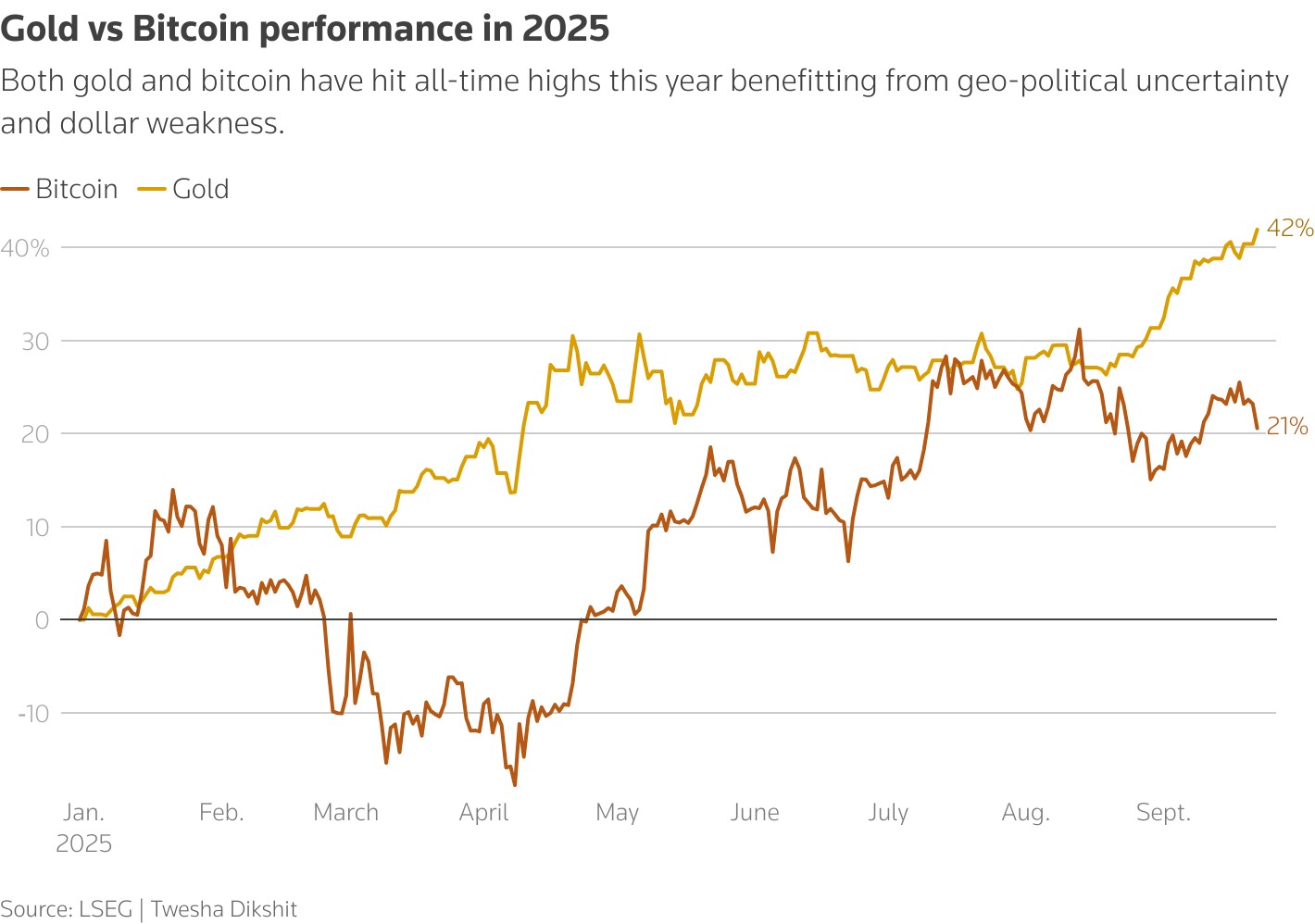 黄金(XAU=)巩固了其避险资产的地位,在美元走弱、地缘政治和关税不确定性以及美联储独立性问题的影响下,价格飙升至超过 3728 美元的新高。而比特币接近 125,000 美元,今年上涨了 20.7%。