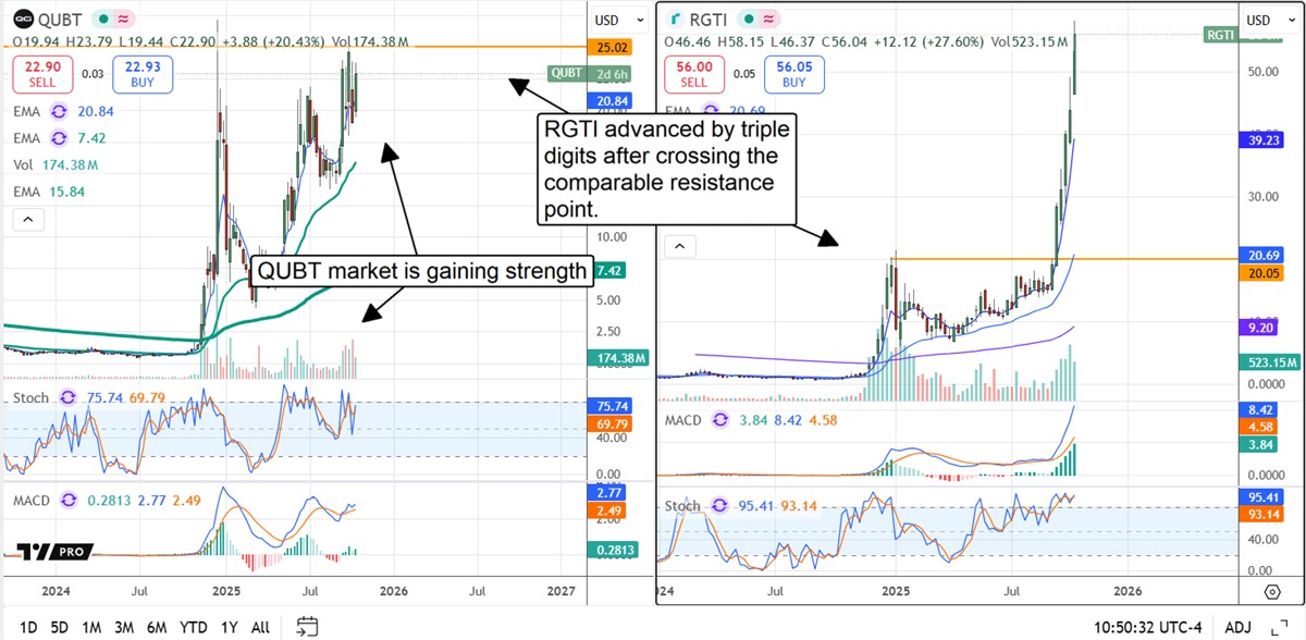 儘管合法問題影響了 Quantum Computing, Inc. 的 NASDAQ: QUBT 股價,但該股票的市場仍然看漲,並有望創下新高。關鍵細節是,創下新高與其他量子股票的走勢一致,這些股票隨後飆升。Rigetti Computing NASDAQ: RGTI 的業務同樣可疑,但在突破可比標記後上漲近 200%,而 D-Wave Quantum NYSE: QBTS 上漲超過 100%,IonQ NYSE: IONQ 上漲約 60%。