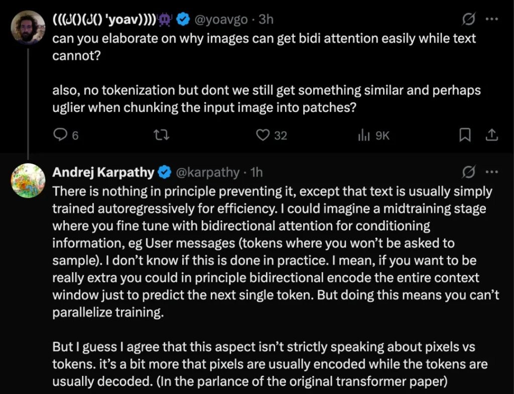 最後他補充道,或許這個方面(雙向注意力)嚴格來説並非像素與 Token 的本質區別,更多是像素通常被編碼(encoded),而 Token 通常被解碼(decoded)(借用原始 Transformer 論文的術語)