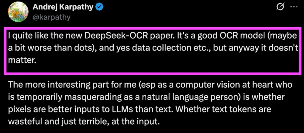 剛剛,AI 大神 Andrej Karpathy 表示非常喜歡 DeepSeek OCR 論文,原話: