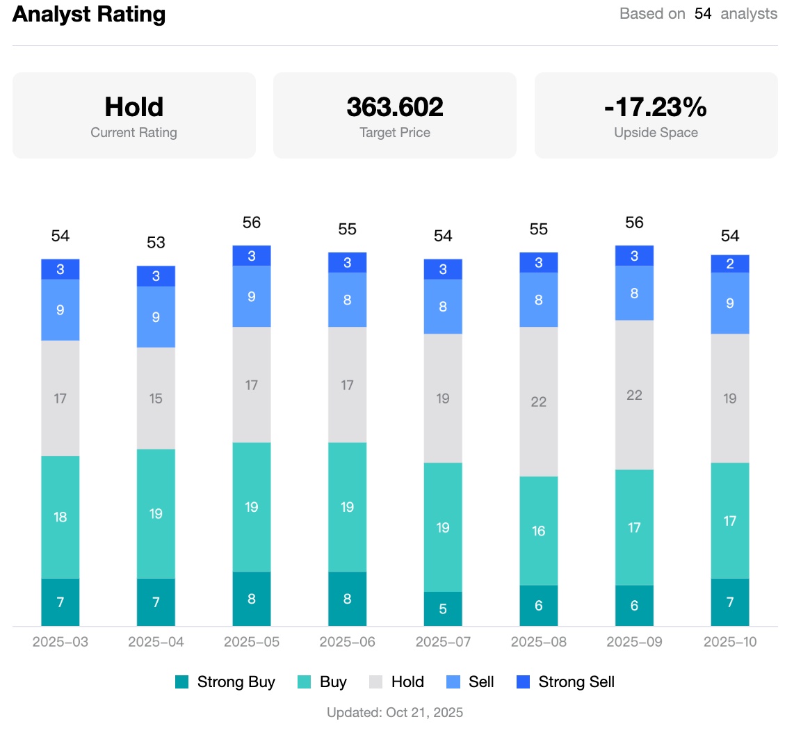 Per TradingKey, the analyst consensus target price for Tesla is $363.60 — about 17% below current levels — reflecting broad analyst caution.